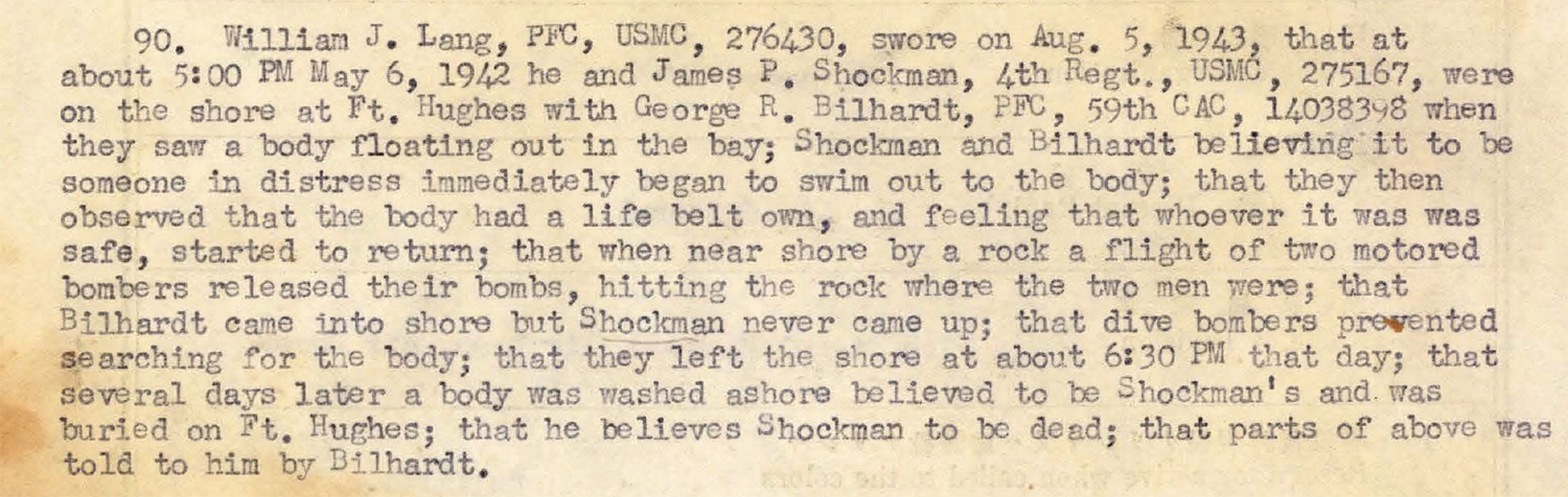 About five hours after the surrender, Shockman and Marine PFC William J. Lang wandered down to the beach, where they met PFC George Bilhardt of the 59th Coast Artillery. A body was seen floating in the bay; Shockman and Bilhardt swam out to the rescue but turned around when they realized that the man was wearing a life belt. Japanese aircraft were droning overhead, and suddenly they heard the whistle of falling bombs. The two Americans were blasted off the rock. Bilhardt resurfaced, stunned and spluttering, and straggled in to shore. Shockman never reappeared.