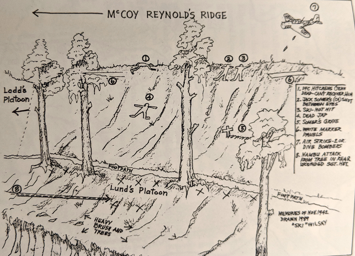 To the right of Ladd’s platoon, Gunner Otto Lund’s 3 Platoon managed to make some headway up the slope they later came to call “Reynolds’ Ridge.” Corporal Herschel “Ski” Wilsky, one of the company’s best scouts, vividly recalled the scene in a 1989 sketch. Private James Hutchens is depicted lying along the top of the ridge, with the somber notation “Dead – can’t recover him.” Wilsky also depicted PFC Jack B. Somers “shot between the eyes” near the top of the ridge.