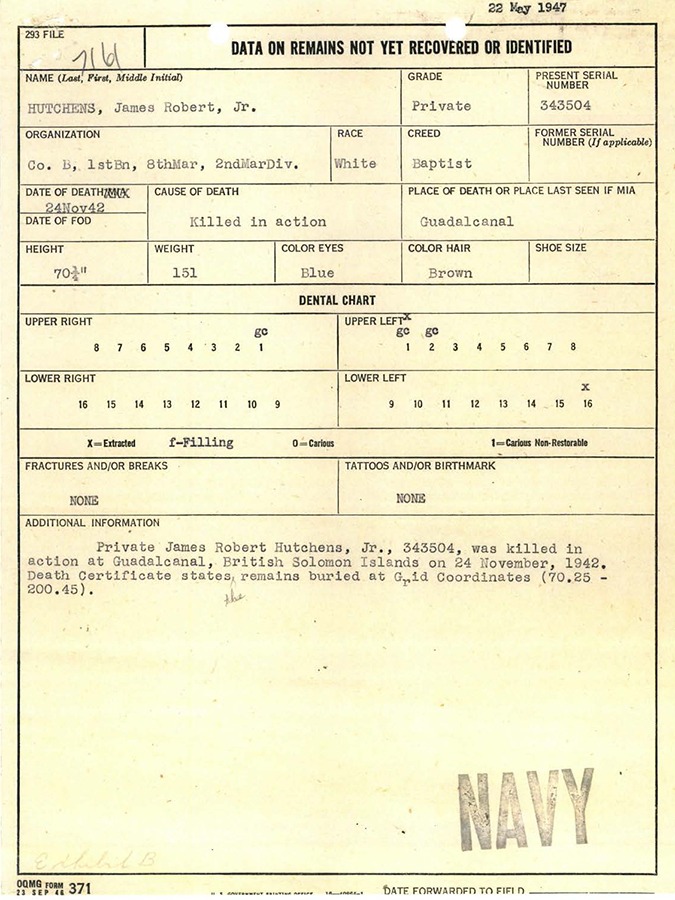 Private Hutchens was reportedly interred at coordinates (70.25-200.45) on the standard Map 104 of Guadalcanal’s north coast, a few yards from fellow Company fallen PFC Somers (70.2-200.2) and Private Robert F. Kessinger (70.3-200.5). Interestingly, the regiment’s operations journal records a request for grave markers near Somers’ location. Unfortunately, despite the Marines’ efforts, this collection of graves was never located after the battle.