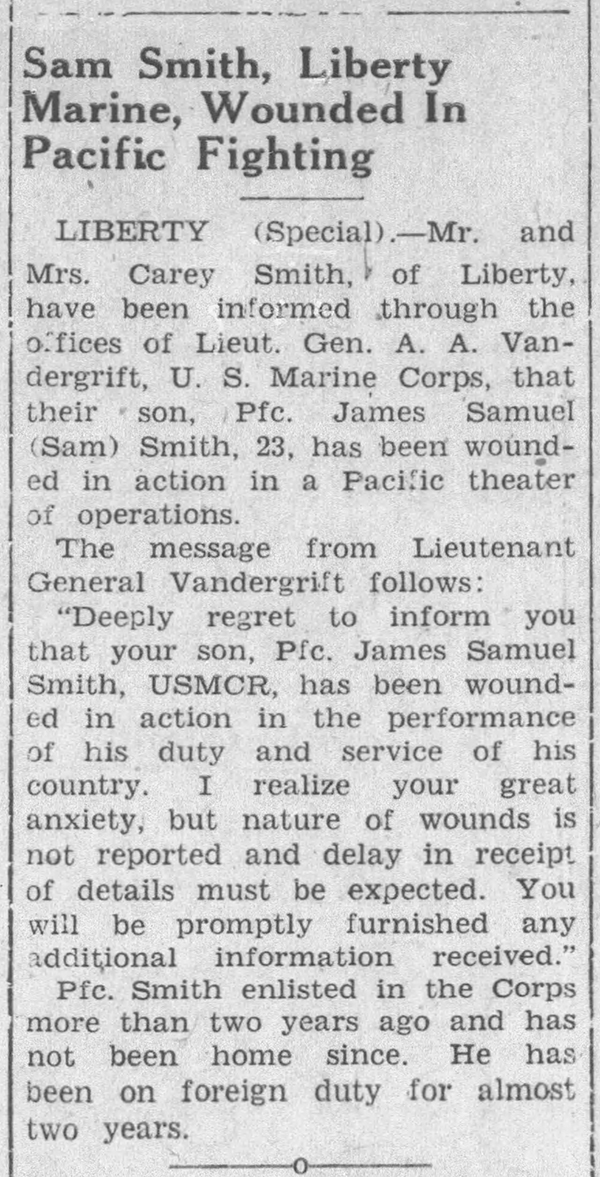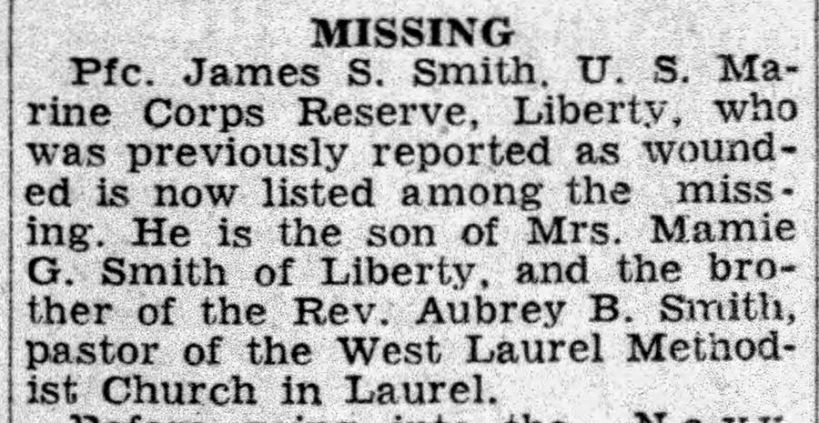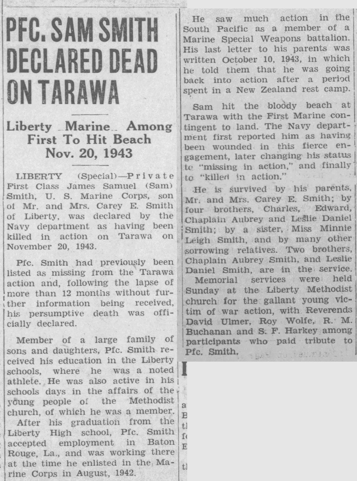 Sam Smith never made it off Betio. His body was found after the battle but evidently lacked identification; it was buried in a mass grave as an unknown. In 1946, the 604th Quartermaster Graves Registration Company exhumed remains from the site (now known as Cemetery 25) but due to the haphazard nature of the original burials, many bones and identifying effects were left behind. Sam Smith was not among those located; he was declared permanently non-recoverable in 1949.