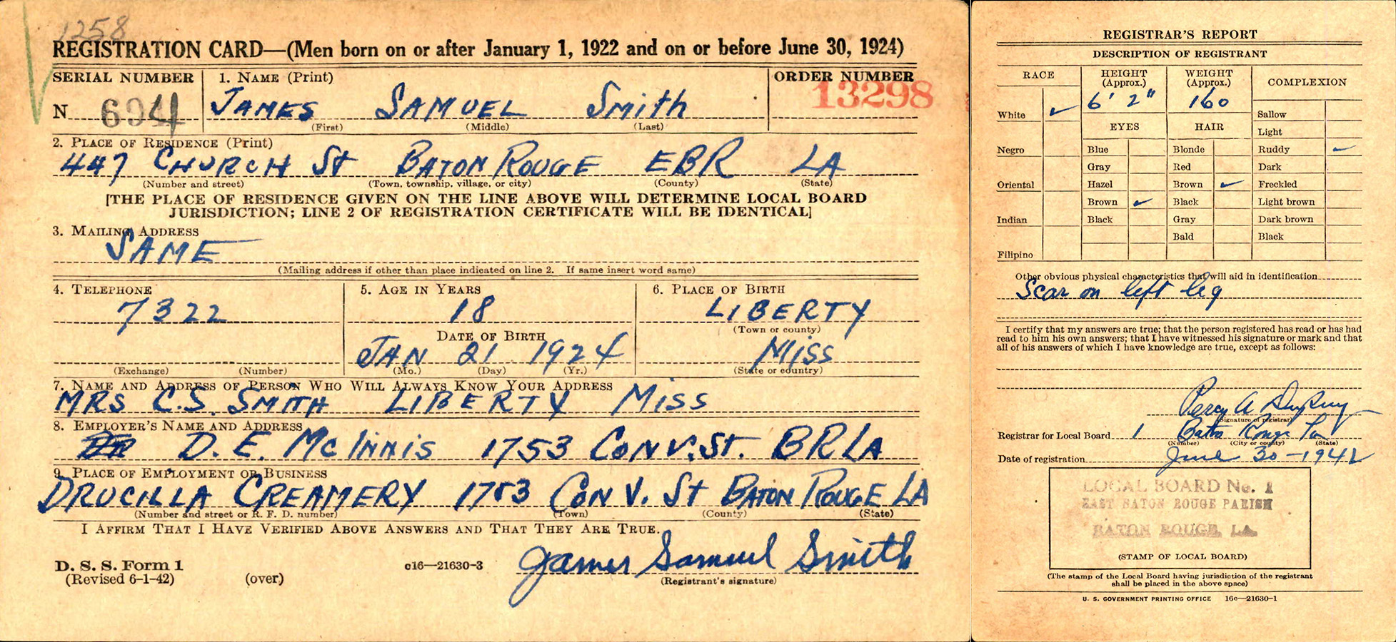 As a youth, Sam attended Amite County schools and was active in local Methodist youth groups. He grew rapidly – at six feet two inches, he was the tallest of the Smith family – and was a star football player at Liberty High School. Sam was an adept student, too, and graduated with the class of 1941. With his sights set on college and a career in medicine, Sam took a job at Drucila Creamery in Baton Rouge, Louisiana, hoping to earn tuition money.