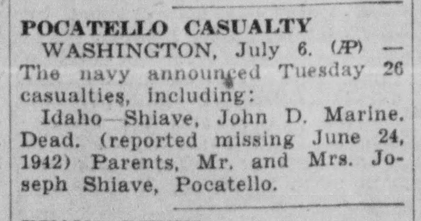 On the night of 5 May 1942, Japanese forces landed on the island. After a fierce fight, the overwhelmed garrison capitulated at 1200 hours on 6 May. PFC Shiave was among those killed in the final defense of the island; no specifics of his fate are currently known.