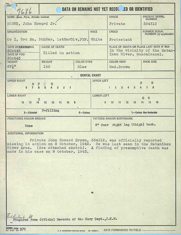 Unknowns X-12, X-14, and X-16 were all buried at around the same time and in the same vicinity. Based on original records, Private Brown may be a potential match for one of these cases. If you are related to John Howard Brown, please contact Missing Marines for more information.