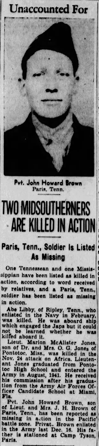 In 1942, Lieutenant John Brown Senior was stationed at Fort Tyson in Paris, TN. The family lived at 314 Edgewood Street, Paris.