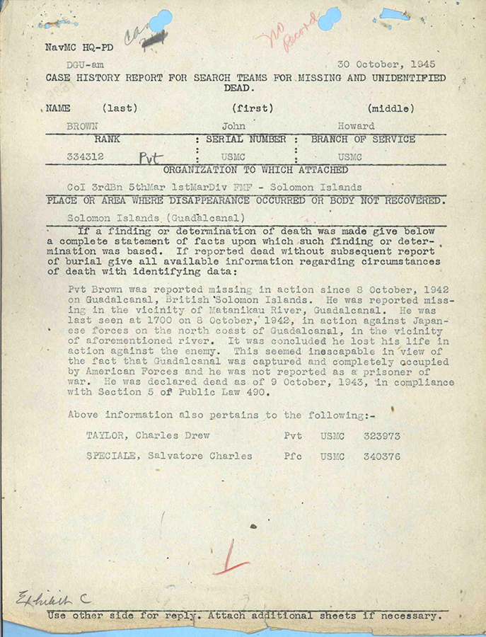 In the morning, Item Company was pulled back from the river and placed in reserve – a welcome chance to care for their wounded and account for their dead. Three men were reported missing in action on 8 October 1942. Private Brown and PFC Salvatore C. Speciale were “last seen in action against the enemy” near the east bank of the Matanikau; both men were reported missing as of 1700 hours. A third Item Company Marine, Private Charles Drew Taylor, disappeared two hours later.