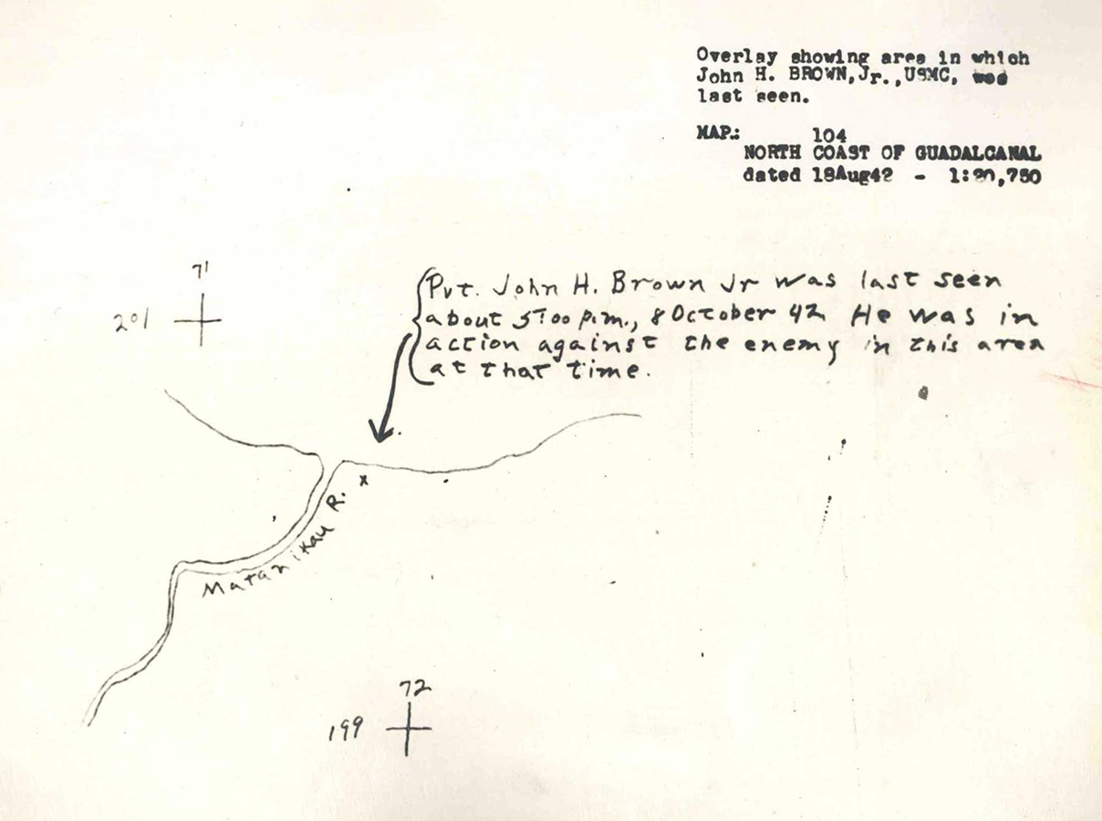 John Brown Junior served in Item Company, 3/5 during the Guadalcanal campaign. From August to September 1942, he participated in heavy combat along the island’s north coast; most objectives centered around control of the Matanikau River.