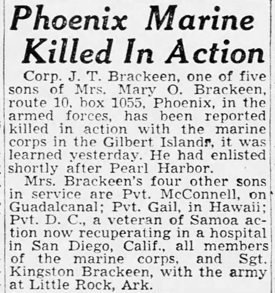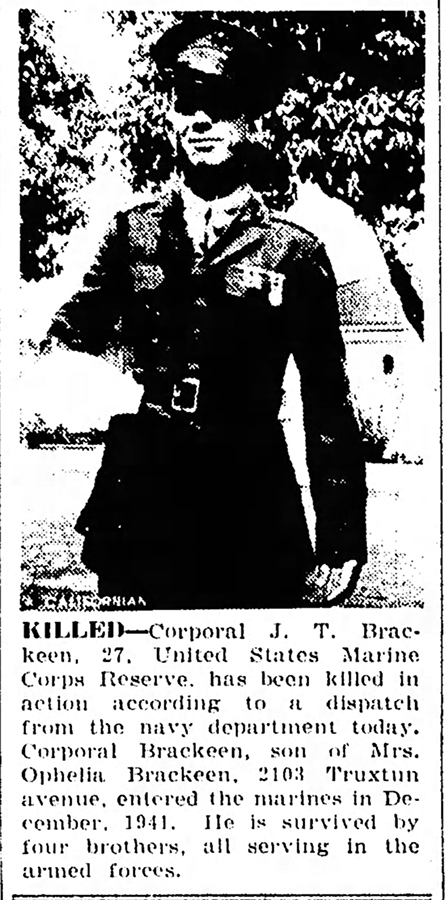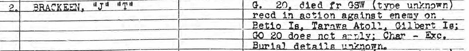 Sergeant John Terry Brackeen – also known as “JT” or “Pat” Brackeen – served with George Company, 2nd Marines at Guadalcanal and during the Tarawa campaign.