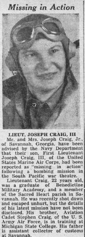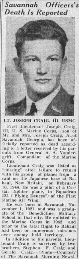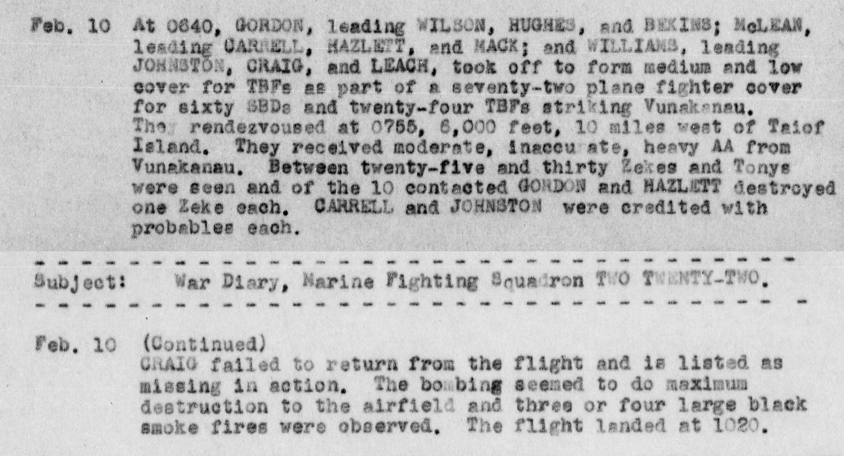 On 10 February 1944, eight “Flying Deuces” – including Joey Craig in F4U-1 #02173 – took off from Piva to provide fighter cover for a strike on Vunakanau airfield near Rabaul. Anti-aircraft fire and enemy fighters were encountered; VMF-222 pilots claimed two kills and reported that “the bombing seemed to do maximum destruction to the airfield.” All returned to Piva except for Lieutenant Craig. He was “last seen at 8,000 feet between Tabera and Vunakanau,” and “believed to have made water landing” but this was never confirmed.