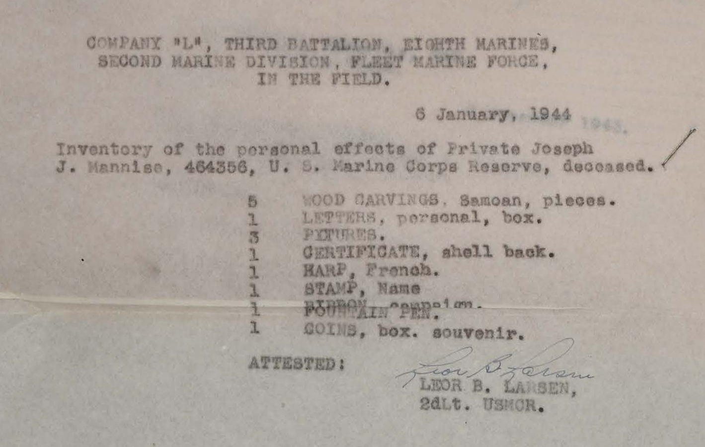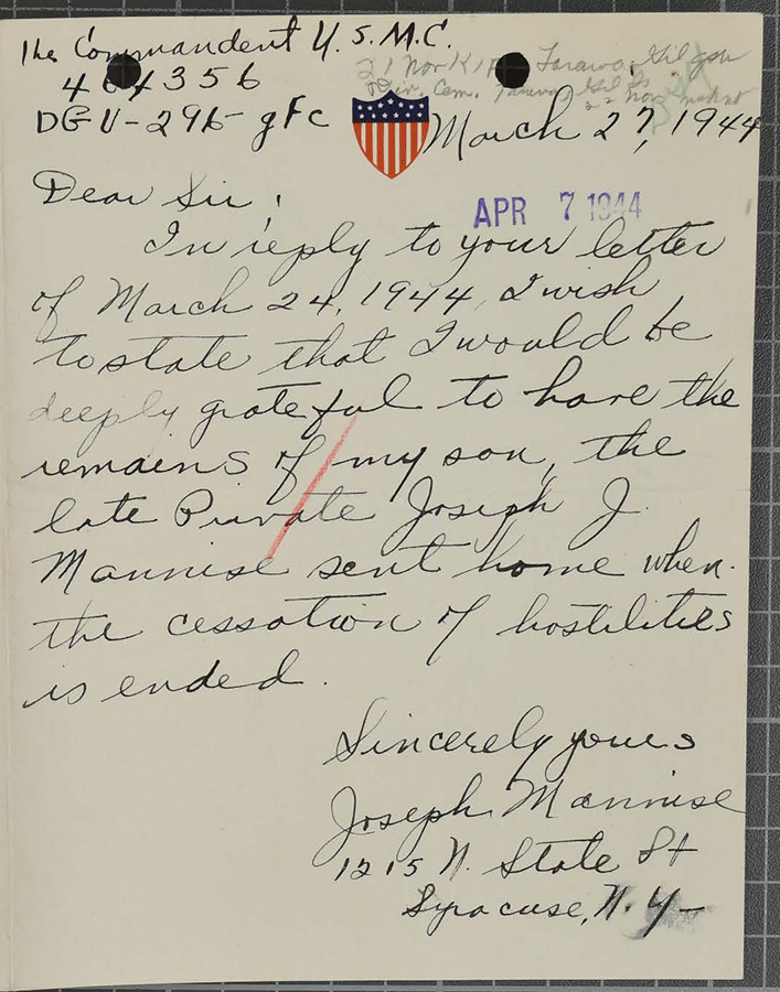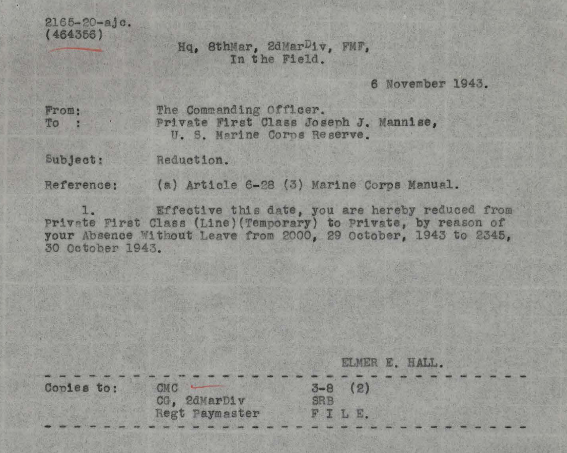 Private Joseph Mannise served with Love Company, 8th Marines during the battle of Tarawa.