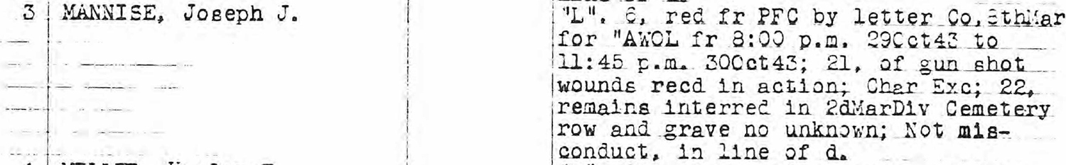 The Marines of BLT 3-8 used the following day to consolidate and strengthen their positions; no general assaults were made, but the men were under constant enemy fire – especially from the Burns-Philp wharf on their flank, and from snipers in the rear. Love Company suffered several fatal casualties: among them was Private Mannise. His official cause of death was “gunshot wounds received in action” – no further specifics of his death are known.