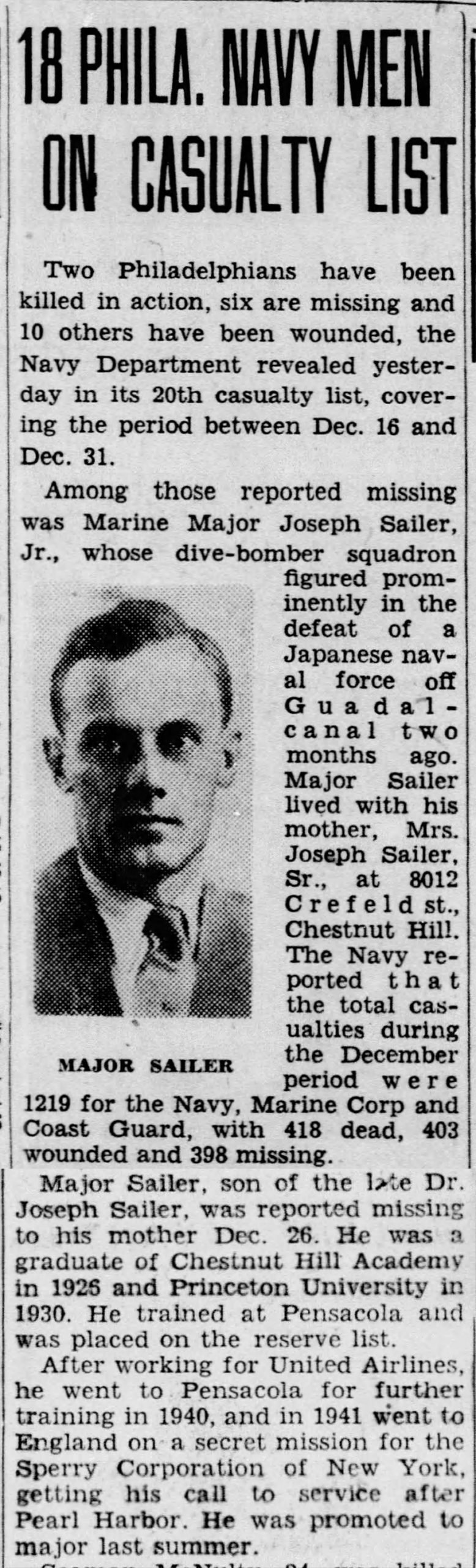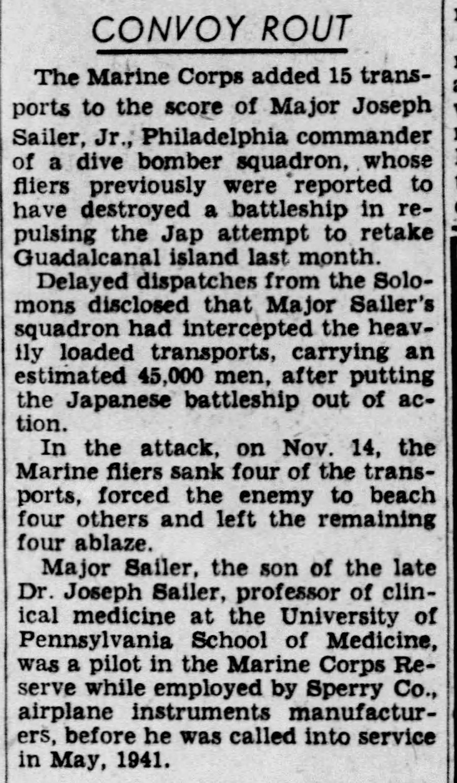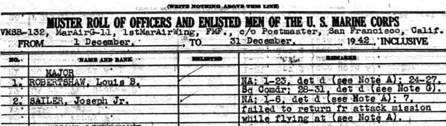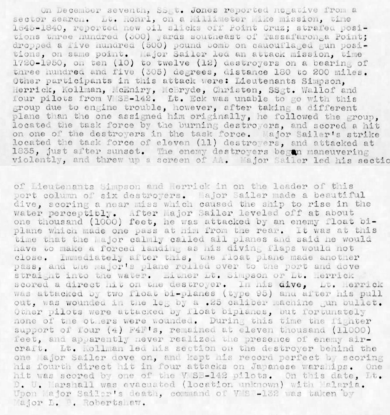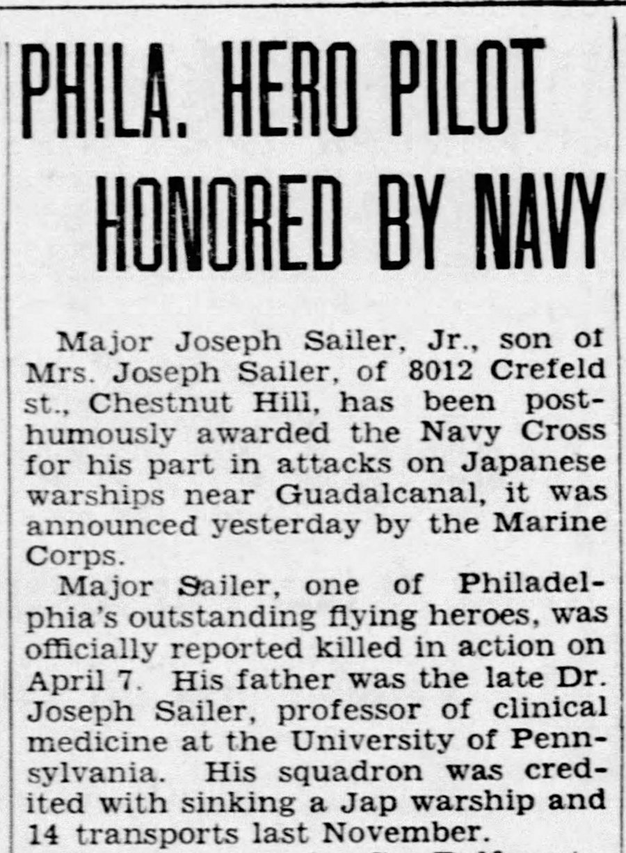 The President of the United States of America takes pride in presenting the Navy Cross (Posthumously) to Major Joseph Sailer, Jr. (MCSN: 0-4675), United States Marine Corps, for extraordinary heroism and distinguished service in the line of his profession while serving as a Pilot in Marine Scout-Bombing Squadron ONE HUNDRED THIRTY-TWO (VMSB-132), Marine Air Group FOURTEEN (MAG-14), FIRST Marine Aircraft Wing, in action against enemy Japanese forces in the Guadalcanal Area of the Solomons Islands from 10 to 15 November 1942. Zealously seeking out and engaging the enemy under extremely hazardous conditions, Major Sailer led six attacks in spite of intense aerial opposition and anti-aircraft fire, scoring direct hits on a Japanese battleship of the Kongo Class, a heavy cruiser, a destroyer and two transports. His determined fighting spirit and unyielding devotion to duty contributed decisively to our success in routing the Japanese forces. His actions at all times were in keeping with the highest traditions of the United States Naval Service.
