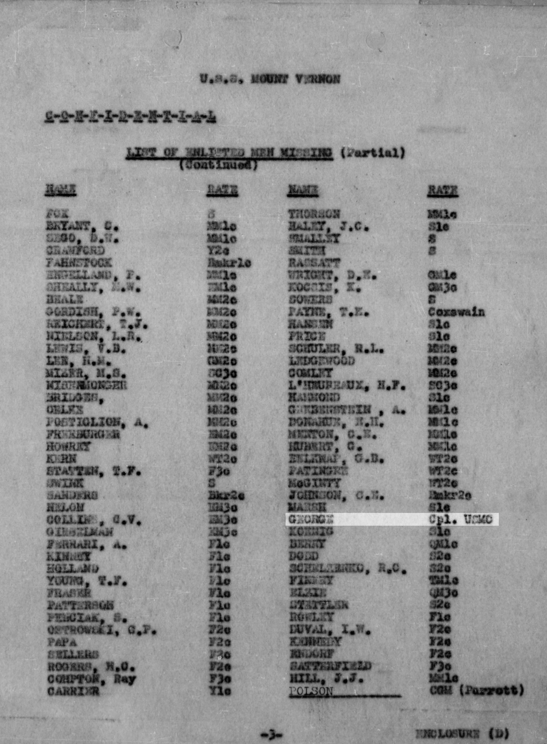 | CIRCUMSTANCES OF LOSS Corporal Kelton George served as a gun captain aboard the cruiser USS Houston (CA-30).George was seriously wounded in action on 4 February 1942, at the battle of Makassar Strait. His injuries were so severe that he was put ashore and treated at Tjilatjap, Dutch East Indies. As Japanese forces drew closer, the hospital was evacuated, and on 27 February a number of ambulatory patients, including Corporal George, were evacuated via the oiler USS Pecos. Japanese dive bombers from the carrier Soryu spotted the Pecos on 1 March 1942 and quickly moved in to attack. Their third attempt was successful, and the Pecos went down in the Java Sea. Kelton George was not among the 230-odd survivors plucked from the sea; he was listed as missing in action, and declared dead as of 2 March 1943. |