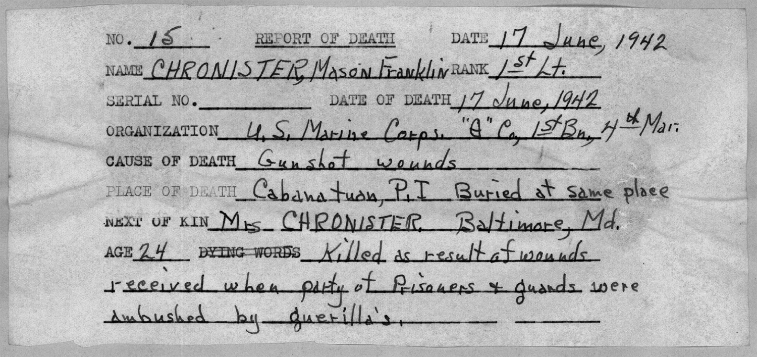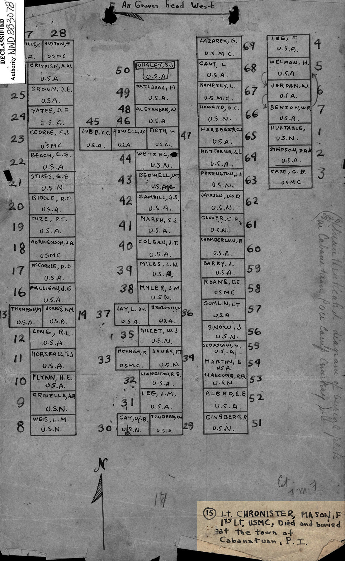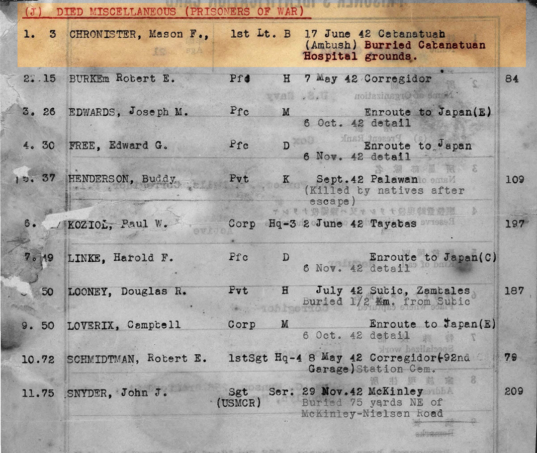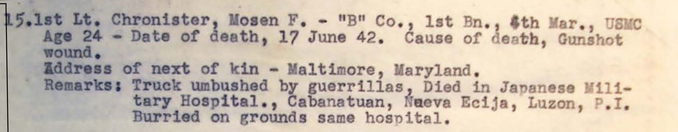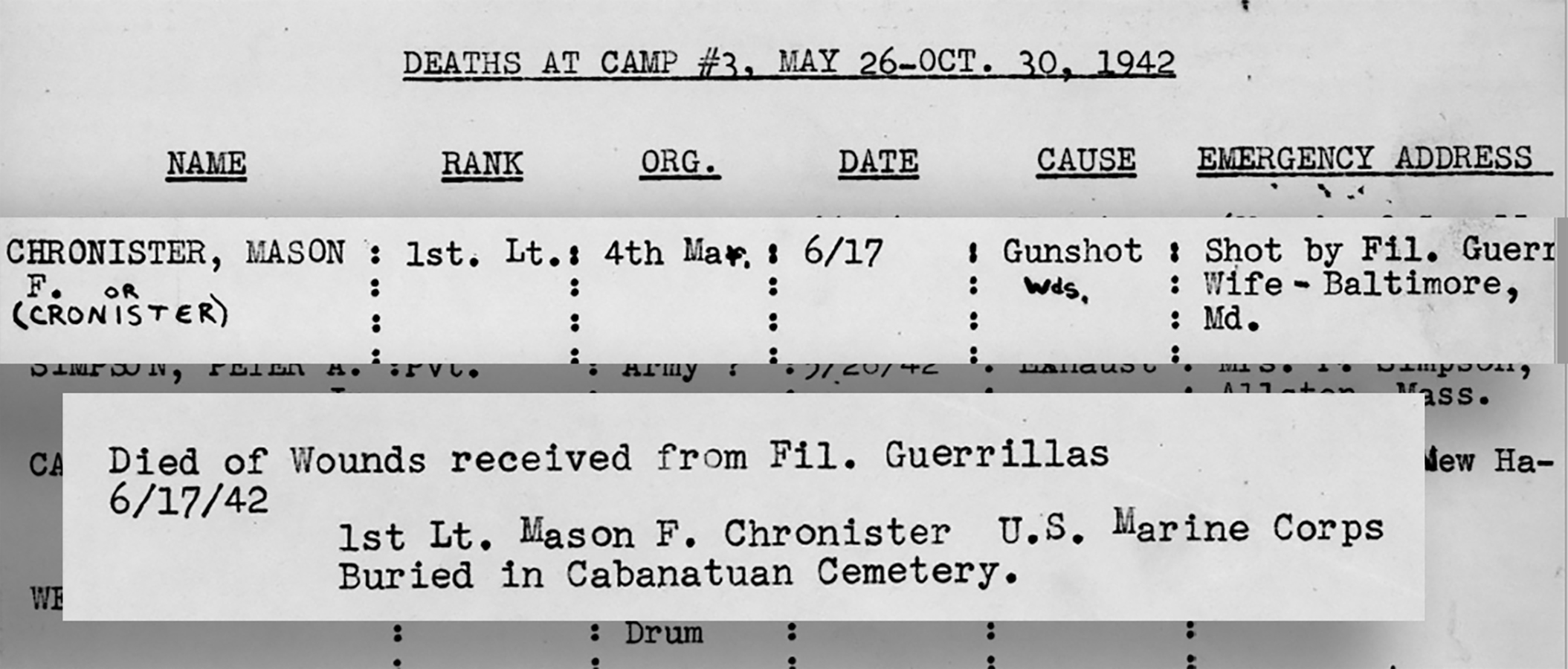 Primary sources offer differing accounts of Chronister’s burial; he may have been buried in the main Cabanatuan camp cemetery, on the Cabanatuan hospital grounds, or somewhere within the barrio itself. The DPAA writes that Chronister was “buried across a creek from the Cabanatuan city dump in a grave reportedly marked by a cross.”