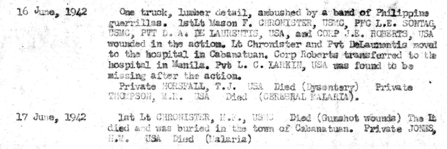 Chronister died and was reportedly buried at a hospital in Cabanatuan.