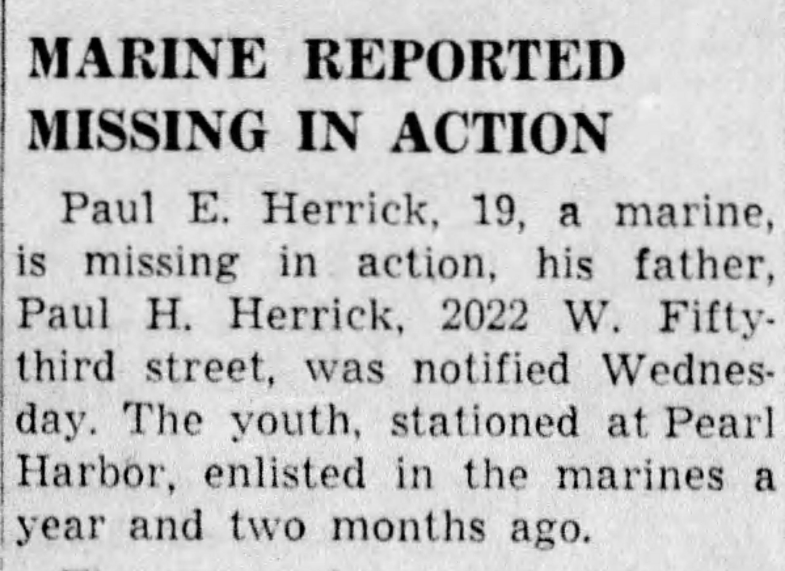 | CIRCUMSTANCES OF LOSS Private Paul E. Herrick served as a member of the Marine detachment aboard the battleship USS Arizona. He was last known to be aboard on 7 December 1941, and was likely on his way to his battle station when the ship’s magazine exploded, sending her to the bottom of Pearl Harbor. Herrick is believed to have gone down with the Arizona, and his remains are considered nonrecoverable. |