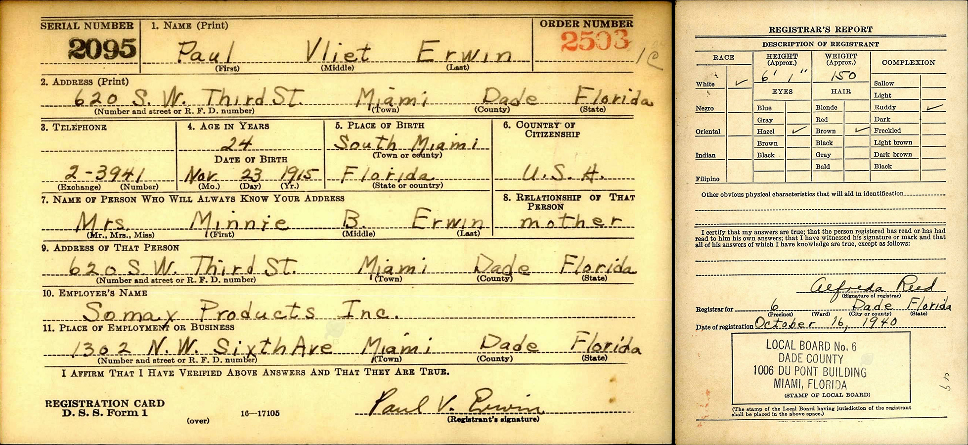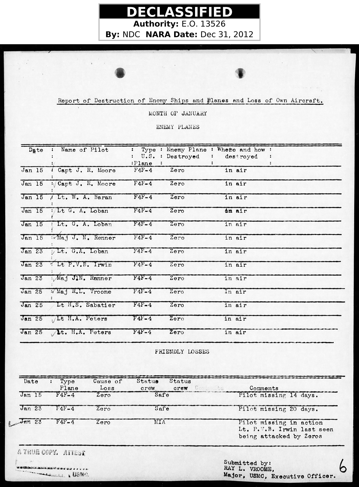 | CIRCUMSTANCES OF LOSS Lieutenant Paul Erwin was a fighter pilot serving with VMO-251 during the Solomon Islands campaign. He was shot down while providing fighter cover for an SBD strike against Japanese warships in “The Slot” on 23 January 1943. He was credited with one Zero destroyed on this date. No trace of “Vliet” Erwin was ever found, and he was officially declared dead on 5 January 1944. |