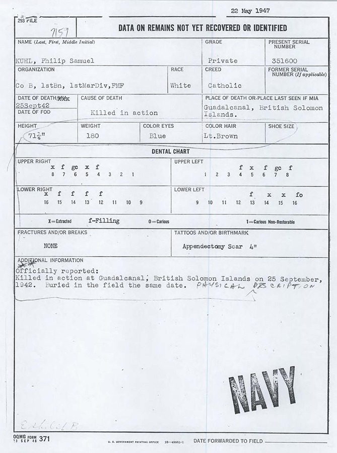 Over the next several days, a few escapees managed to reach their company. Seventeen Marines and a Navy corpsman did not return, and were optimistically reported as “missing in action.” Among them was Private Kuhl.