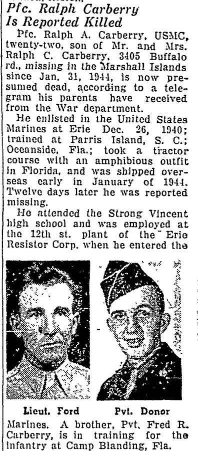 PFC Carberry and PFC Darwin E. Hemenway were “last seen off Jacob Island… in a LVT in sinking condition.” Both Marines were reported as missing during the landings, and ultimately declared dead on 1 February 1945.