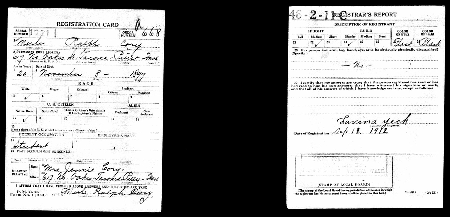 Merle Ralph Cory was born in Napavine, Washington, on 8 November 1897. He was the oldest of four boys raised by David and Jennie Keady Cory and spent his earliest days on the family farm in Lewis County. The family eventually relocated to Tacoma, and the Cory boys grew up at 617 North Oakes Street. Merle proved to be a studious youth, and graduated from Tacoma’s Stadium High School in 1918. He also decided to stop using “Merle” in favor of his middle name and went by “Ralph Cory” for most of his life.