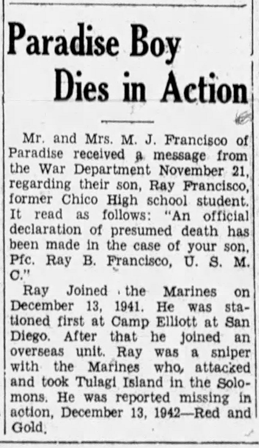 The Marines reached their objective by evening and set about accounting for their casualties. Easy Company suffered four killed and four missing during the day’s attack; PFC Francisco was one of the missing. No trace of his remains was ever located, and he was ultimately declared dead on 11 November 1943.