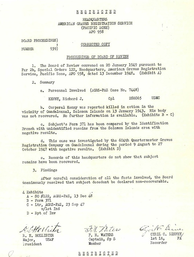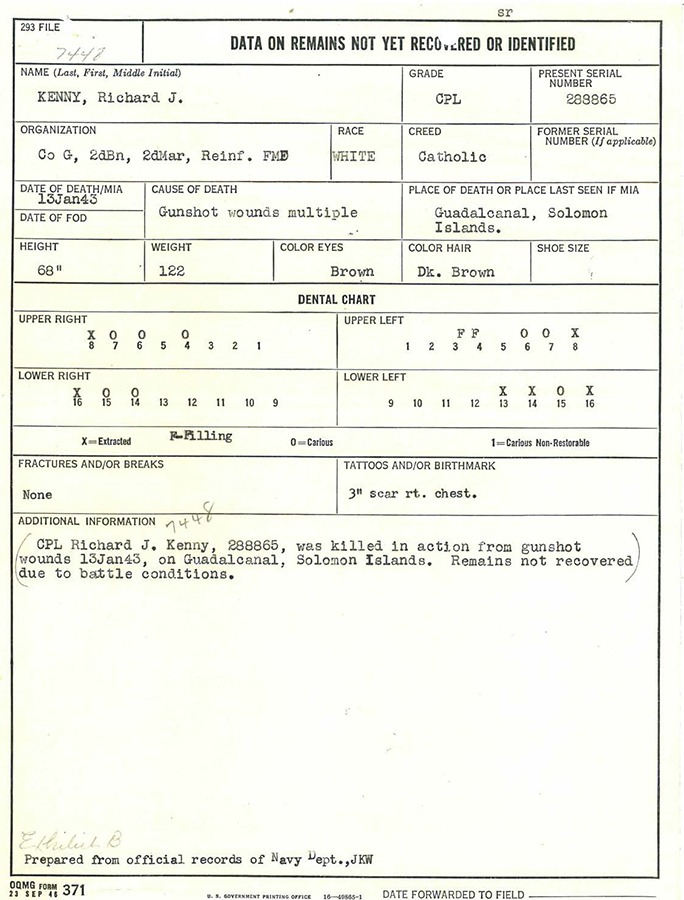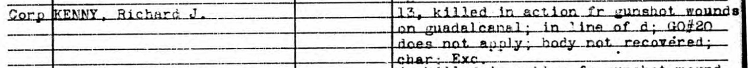 George Company clung grimly to its new position; at one point, two platoons of the regiment’s Weapons Company were “thrown” into their sector to help hold the line as riflemen. They stuck to their gains until relieved by a company from the 6th Marines near dusk. Remarkably, G/2/2 reported only one Marine killed in action on 13 January: Corporal Richard Kenny, a twenty-year-old NCO in the service since 1940. Casuatly reports note that he died of multiple gunshot wounds.