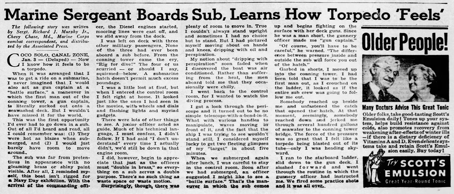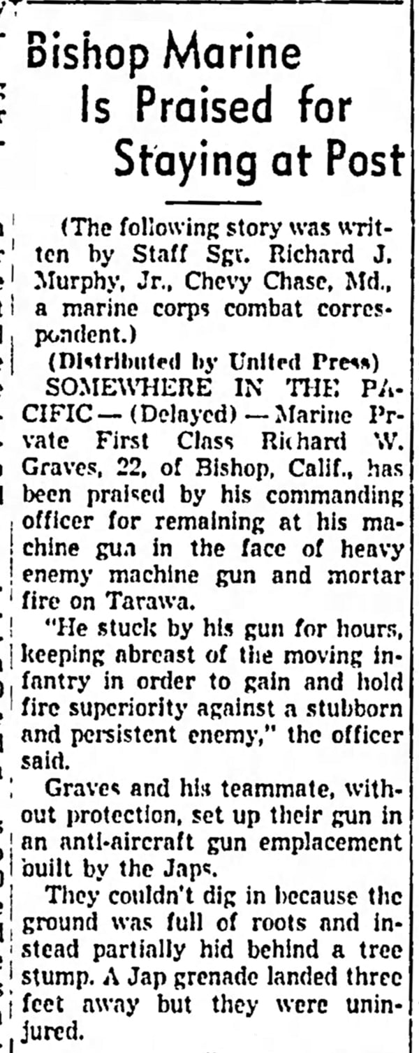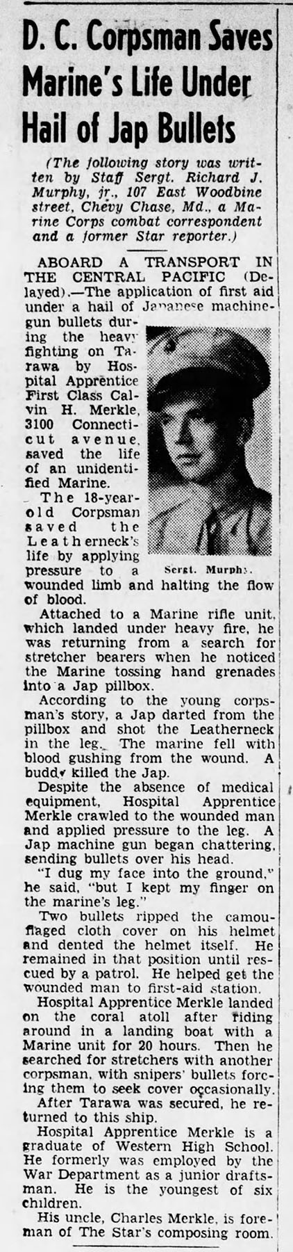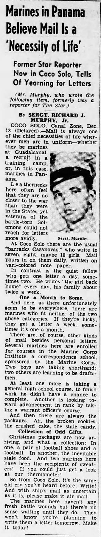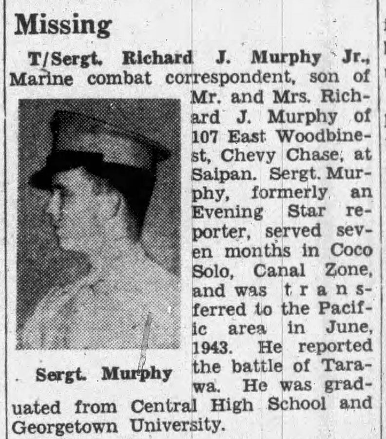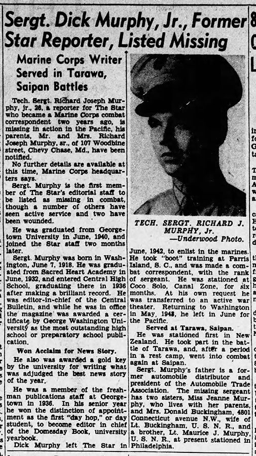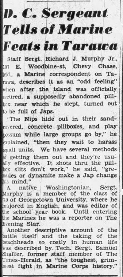 Richard J. Murphy, Jr., left his job at the Washington Evening Star to enlist in the Marine Corps in the summer of 1942. As a professional journalist, he was assigned duty as a combat correspondent in the Canal Zone before transferring to the 6th Marines in mid-1943. Murphy made his first combat landing at Tarawa on 21 November 1943, and his reports on the battle were published in newspapers across the country.