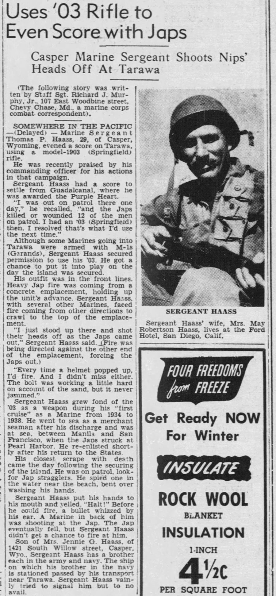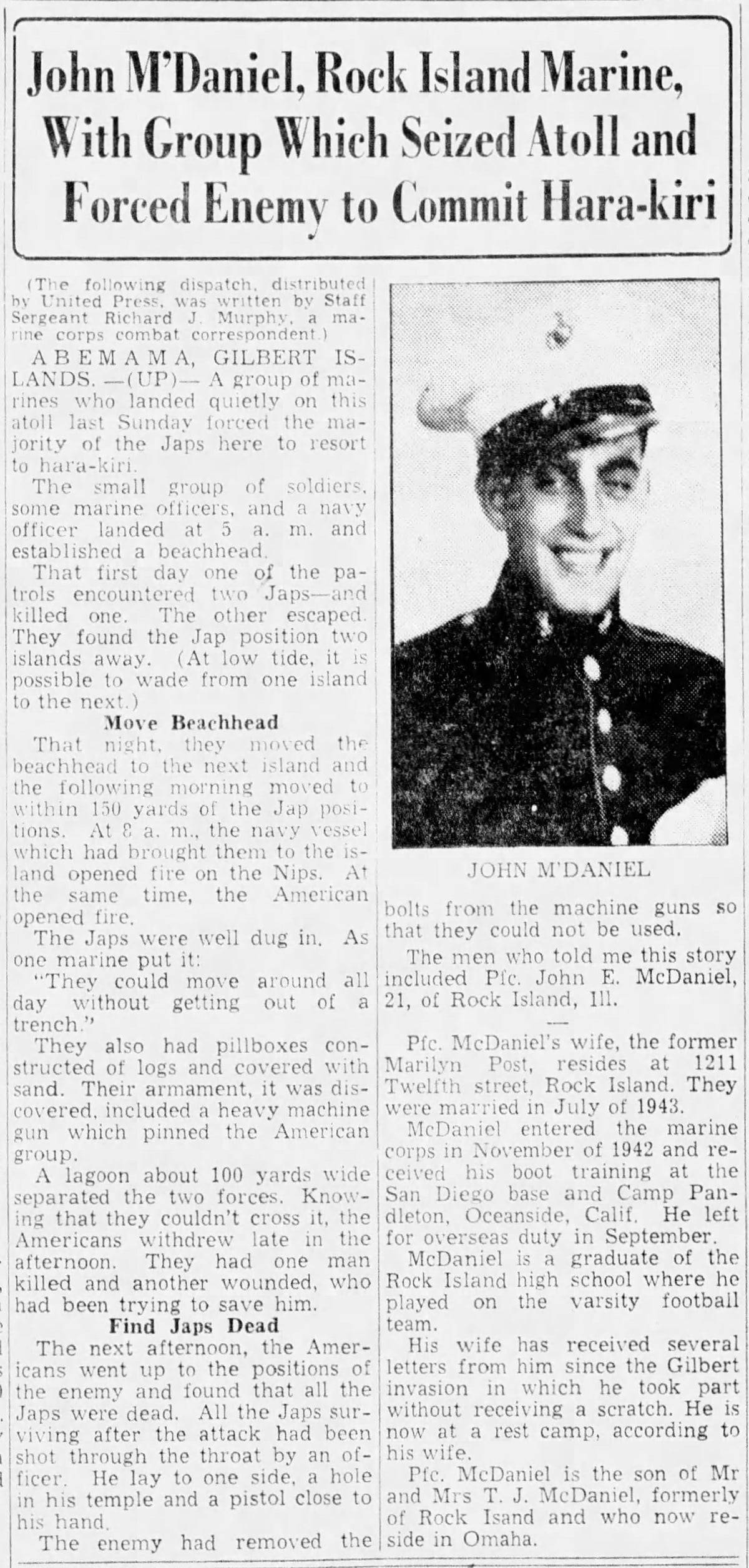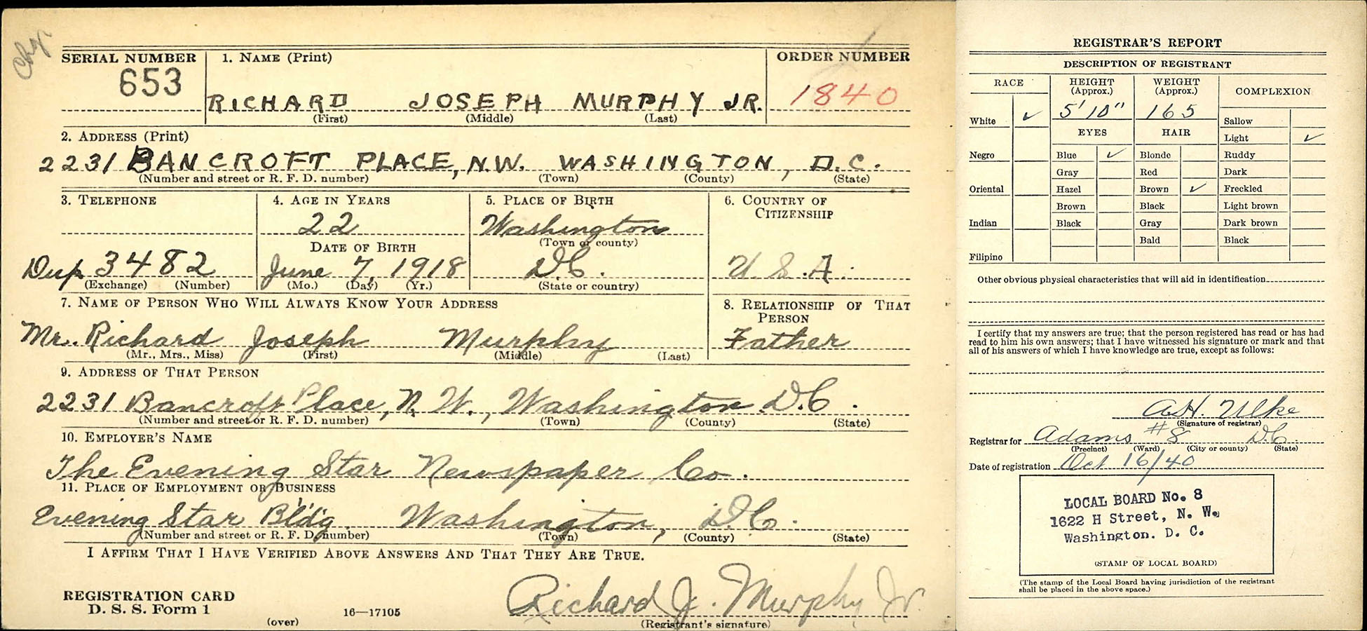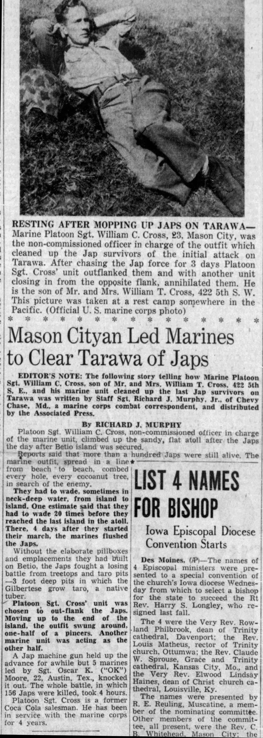 Richard J. Murphy, Jr., left his job at the Washington Evening Star to enlist in the Marine Corps in the summer of 1942. As a professional journalist, he was assigned duty as a combat correspondent in the Canal Zone before transferring to the 6th Marines in mid-1943. Murphy made his first combat landing at Tarawa on 21 November 1943, and his reports on the battle were published in newspapers across the country.