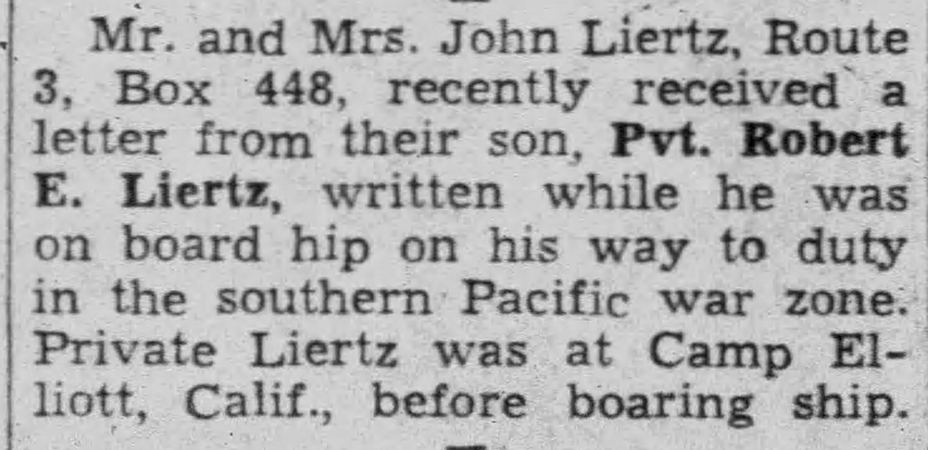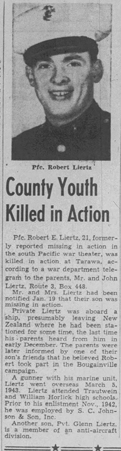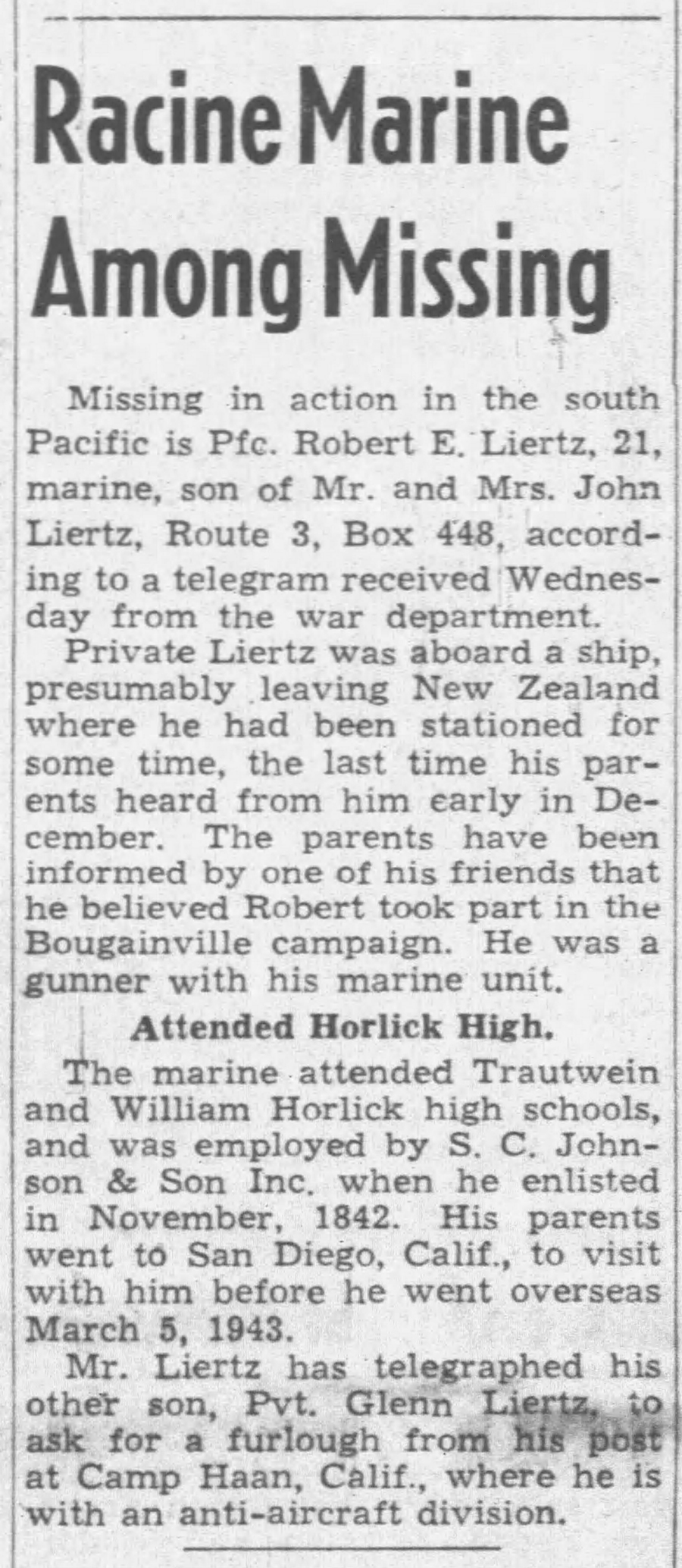 PFC Liertz was last seen alive during the landing operation. He was reported as missing in action after the battle; nothing more was ever learned of his whereabouts, and he was later declared dead as of 20 November 1943.
