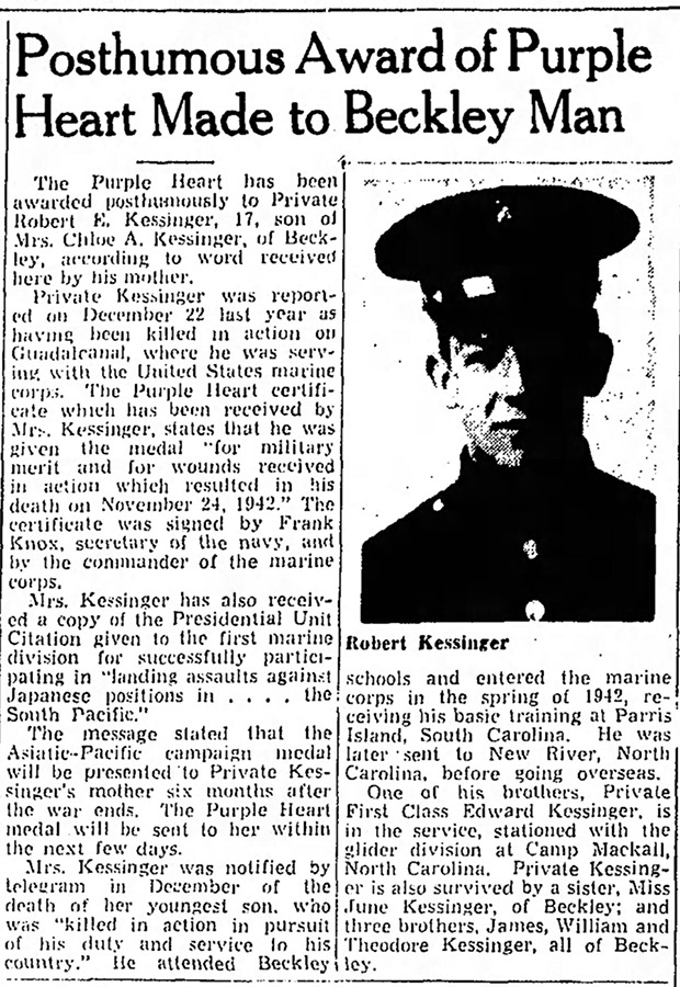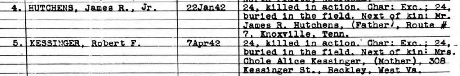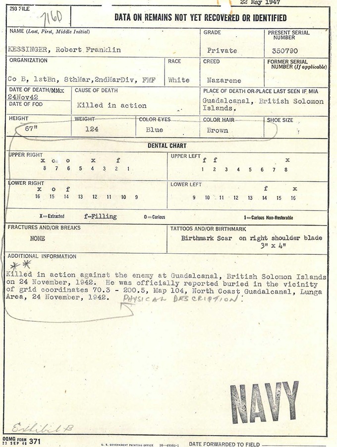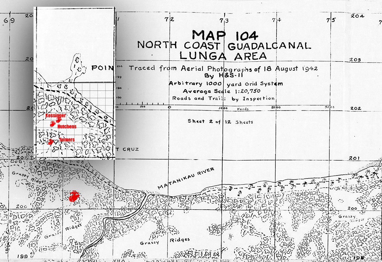 Private Kessinger was reportedly interred at coordinates (70.3-200.5) on the standard Map 104 of Guadalcanal’s north coast, a few yards from fellow Company fallen PFC Jack B. Somers (70.2-200.2) and Private James R. Hutchens, Jr. (70.25-200.45). Interestingly, the regiment’s operations journal records a request for grave markers near Somers’ location. Unfortunately, despite the Marines’ efforts, this collection of graves was never located after the battle.