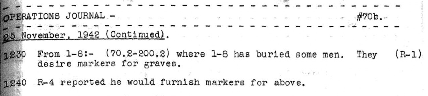 In April 1944, a Graves Registration team located the isolated graves of several 1/8 Marines killed in the November 1942 action: Privates Richey, Clarence Evans, Gilbert Gray, and PFC William Florence from Able Company, and Private McCoy Reynolds from Baker Company. All were identified and returned to their families after the war.
