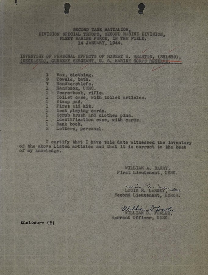 Gunnery Sergeant Robert H. Wharton served with Headquarters and Service Company, Second Tank Battalion.