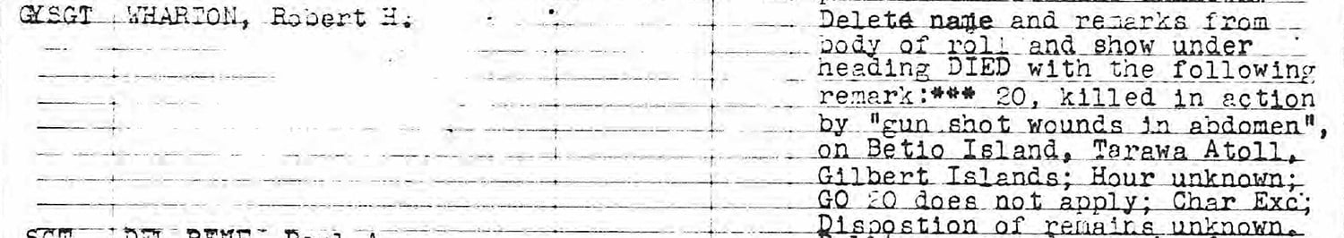 Gunnery Sergeant Wharton was killed at an unspecified location on Betio.