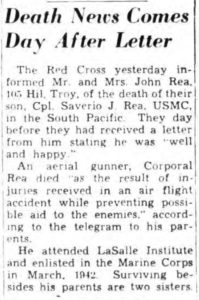 CIRCUMSTANCES OF LOSS On 9 June 1943, Corporal Rea boarded TBF-1 #06352 along with Major Howard F. Bowker, Jr., 1Lt. Frederick W. Follmer, Jr., and Sgt. Simon E. Goldstein for a training flight. After simulating a bombing run against a group of friendly cruisers, Bowker brought his flyers around the tip of Aoba Island for a second pass. Eyewitnesses later reported that Bowker’s Avenger suffered a “structural failure” on the approach, and that it crashed into the sea about six miles northeast of the fighter strip near Turtle Bay. The plane sank quickly; no survivors were found, and no remains could be recovered. |