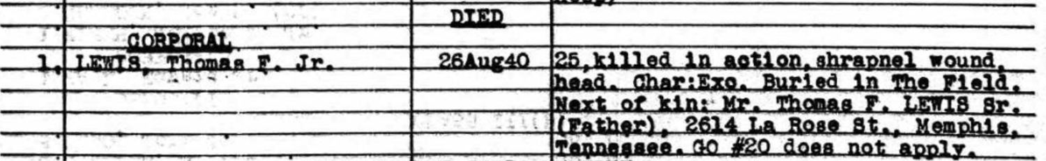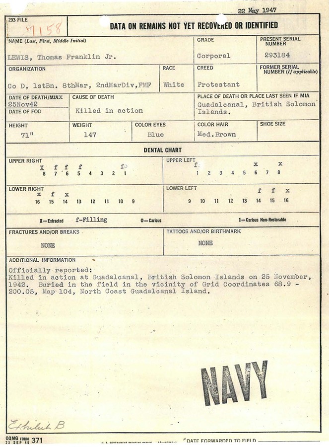 Lewis was reportedly buried in the field at coordinates (68.9-200.05) on the standard Map 104 of Guadalcanal’s north coast. The 8th Marines reported a Japanese mortar position in that area; Lewis may have been part of a combat patrol attempting to take out this weapon, but there are no eyewitness reports to confirm this theory.
