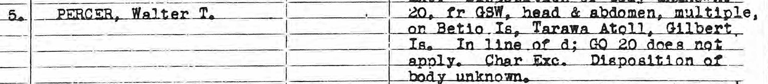 Corporal Percer was killed in action at an unspecified location on Betio.