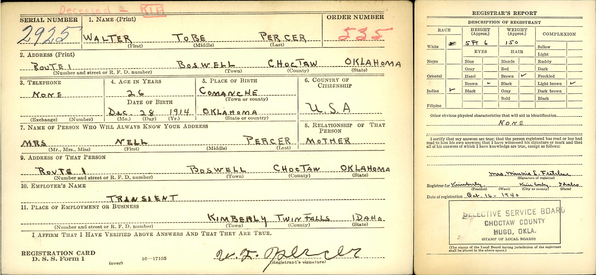 (“Transient” on Selective Service)