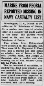 | CIRCUMSTANCES OF LOSS Corporal Warren M. Edenburn was an aviation radioman and gunner assigned to VMSB-131, a Marine dive-bomber squadron stationed on Espiritu Santo. On 14 March 1943, Corporal Edenburn was assigned to a ferry flight heading from Santo to Guadalcanal. The aircraft were TBF Avengers flown by members of VMSB-143; each plane carried a pilot and a single crewman. On the way to Henderson Field, a violent storm scattered the ferry formation and downed five of the TBFs. Ten Marines, including Edenburn, vanished into the Pacific. Warren Edenburn was declared dead on 15 March 1944. |