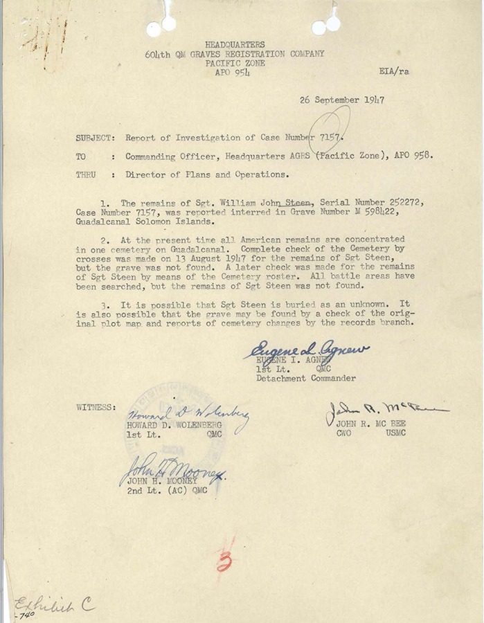 Sergeant Steen was one of the first (if not the first Marines to die on Guadalcanal itself. There was no cemetery on the island, and so his comrades buried him in the field . The location was recorded as “Grave M598422” – but the significance of these coordinates is no longer known, and his remains may still lie in their temporary grave on Guadalcanal.